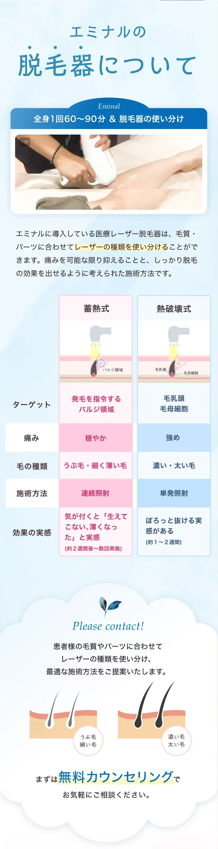 エミナルクリニックは安いだけではなく、スタッフの技術力向上に力を入れていたり、毛質によってレーザーの種類を使い分けることでしっかりと効果を出せることや、1回の来院で全身丸ごと施術できるなど、様々なポイントがあります。うなじや背中、お尻のシェービングが無料なところも魅力的ですね。